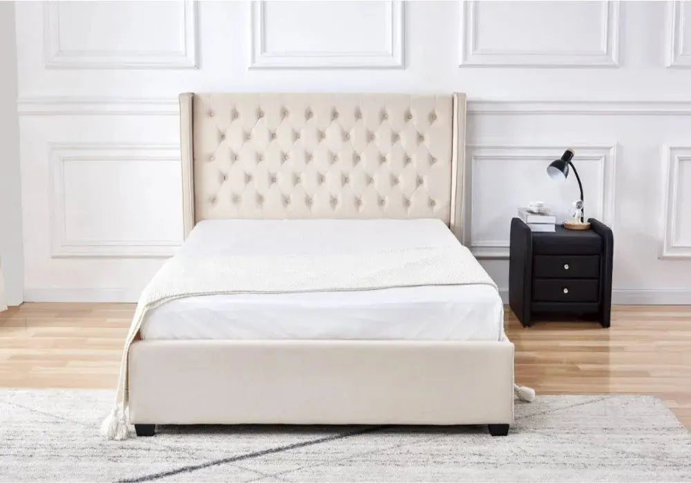 The Eres velvet tufted bed (160×200 cm) features luxurious button-tufted velvet upholstery in Beige, Black or Mocha — bringing elegance and softness to your bedroom.