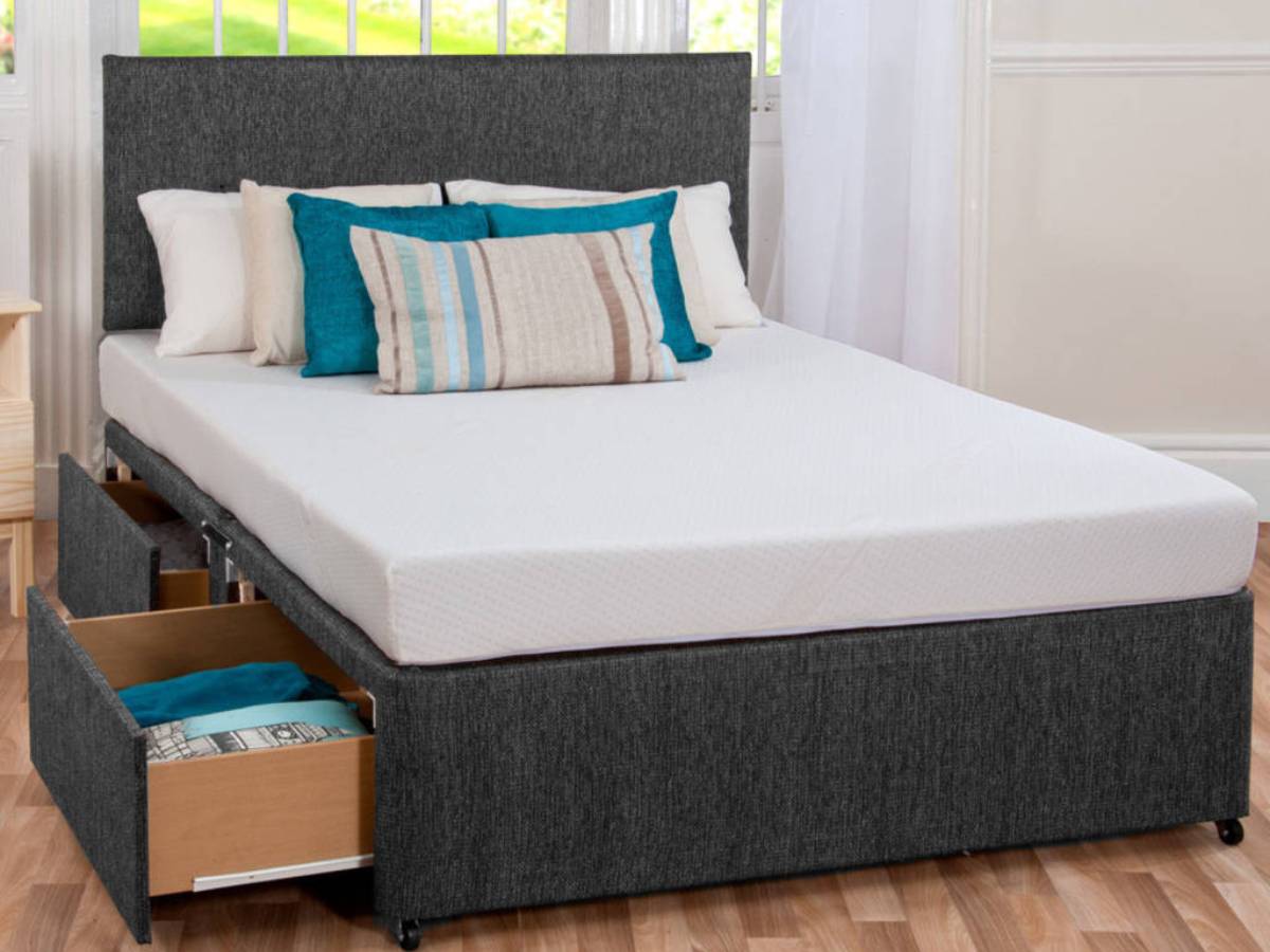 Divan bed with Sleep Plus hybrid mattress and headboard. Multiple colour options. From £299. Free UK delivery.