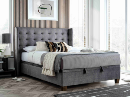 The Kaydian Walkworth Ottoman Bed from Coffralit is a premium ottoman bed with a side-opening gas-lift storage compartment and a beautifully upholstered winged headboard.