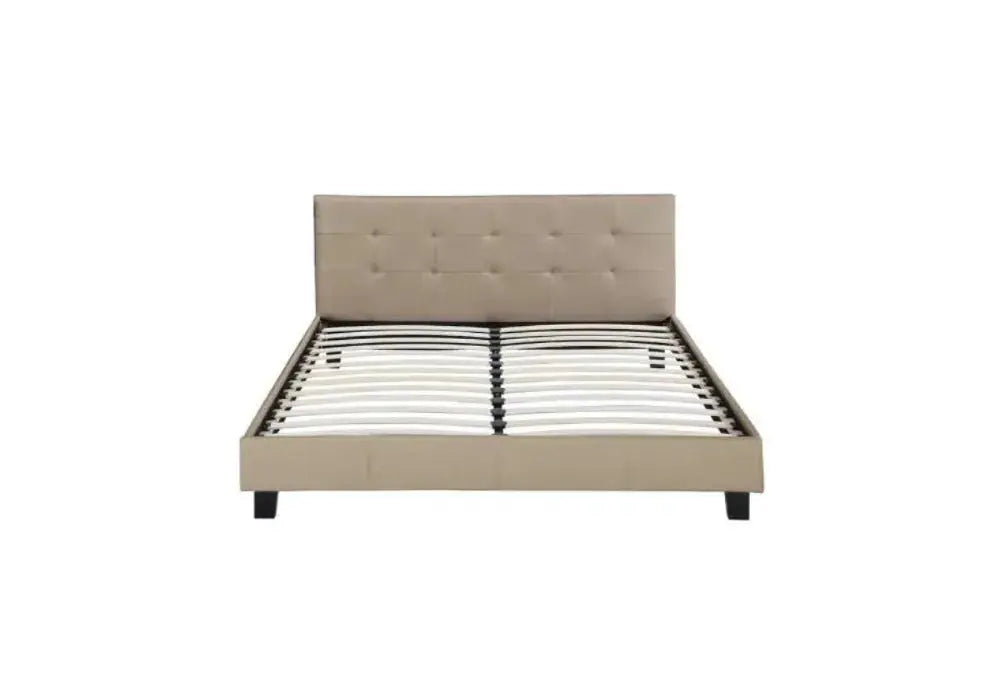 A taupe PVC bed with tufted headboard, slatted base included, available in 140×190 and 160×200. Mattress not included.