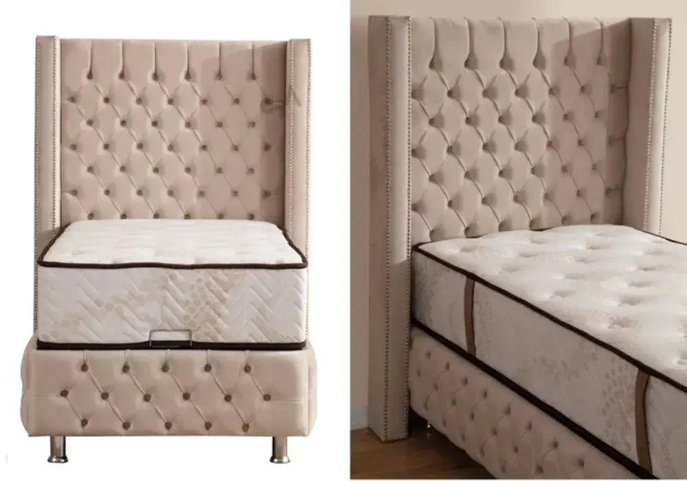 Your storage bed brings elegance and modernism to your bedroom. The studded headboard, velvet fabric and chrome legs create a royal and contemporary style.